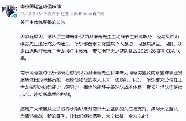 南京同曦是在12月9日下午15:17官宣貝西洛維奇下課的消息的,按照南京同曦的說法,貝西洛維奇因為家庭原因,同意其辭職。同時宣布了遼寧男籃昔日悍將王世龍接手,成為南京同曦新的主教練。