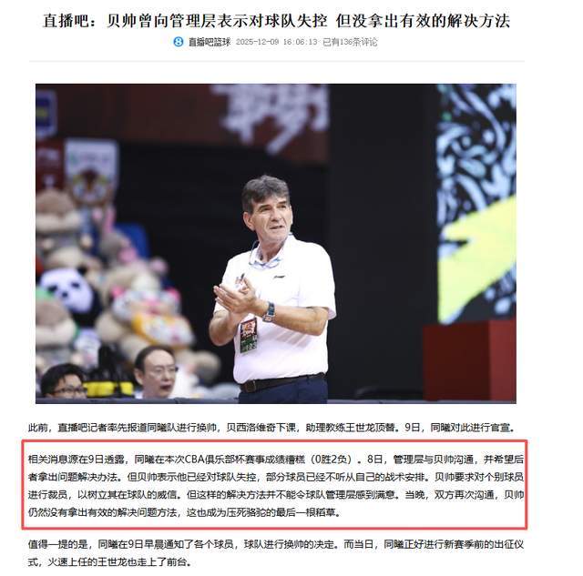 事情的真相真是如此嗎?直播吧對此給出了最新的說法,沒想到,并非家庭原因,也非戰(zhàn)績原因,而是“對球隊失控”。按照直播吧在12月9日16點06分的報道,“相關消息源在9日透露,同曦在本次CBA俱樂部杯賽事成績糟糕(0勝2負)。8日,管理層與貝帥溝通,并希望后者拿出問題解決辦法。但貝帥表示他已經(jīng)對球隊失控,部分球員已經(jīng)不聽從自己的戰(zhàn)術安排。貝帥要求對個別球員進行裁員,以樹立其在球隊的威信。但這樣的解決方法并不能令球隊管理層感到滿意。當晚,雙方再次溝通,貝帥仍然沒有拿出有效的解決問題方法,這也成為壓死駱駝的最后一根稻草。”
