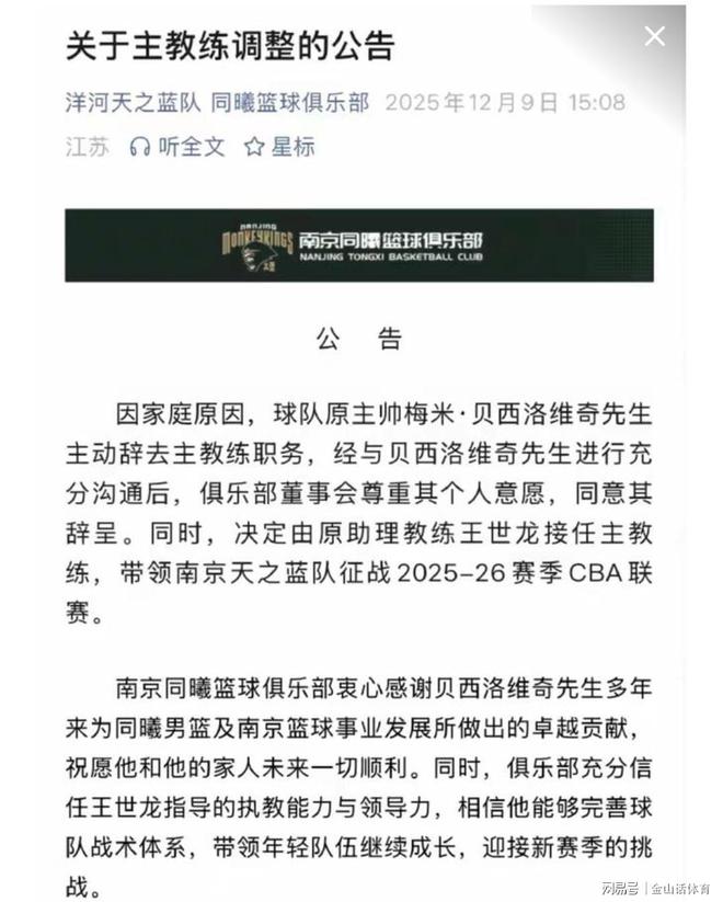 根據(jù)同曦俱樂部的公告,原主帥梅米-貝西洛維奇,是因個人都家庭原因,自己主動辭掉主教練職務(wù)的。因此,俱樂部決定將原助理教練王世龍轉(zhuǎn)正,接任球隊(duì)主教練,帶領(lǐng)南京同曦征戰(zhàn)2025-26賽季CBA聯(lián)賽。同曦籃球俱樂部對貝西洛維奇為球隊(duì)作出的貢獻(xiàn),給予了充分肯定,同時也充分信任王世龍的執(zhí)教能力。