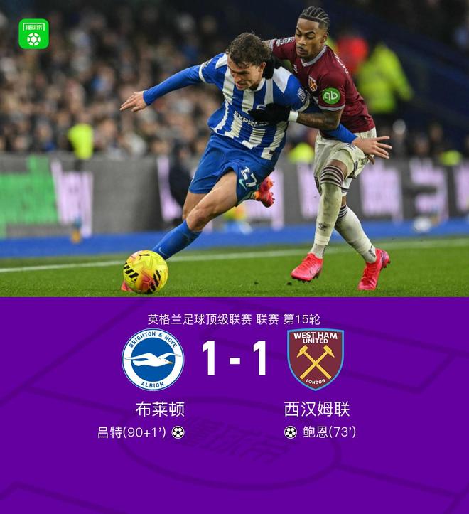 北京時間12月7日,英超聯(lián)賽第15輪,布萊頓坐鎮(zhèn)主場迎戰(zhàn)西漢姆聯(lián)。上半場,帕奎塔遠射造險;下半場,威爾遜助攻,鮑恩倒地情況下小角度破門。隨后,呂特亂戰(zhàn)中小角度破門扳平比分。費布魯亨屢獻神撲。最終雙方1比1握手言和。